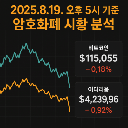 2025년 8월 19일 오후 5시 기준, 비트코인은 11만5천 달러선, 이더리움은 4,200달러대에서 거래되며 약세를 보였다. 단기 조정세는 지속되고 있으나, 장기적 상승 흐름은 여전하다. 다가오는 잭슨홀 미팅이 향후 암호화폐 시장의 방향성을 결정할 핵심 이벤트가 될 것이다.